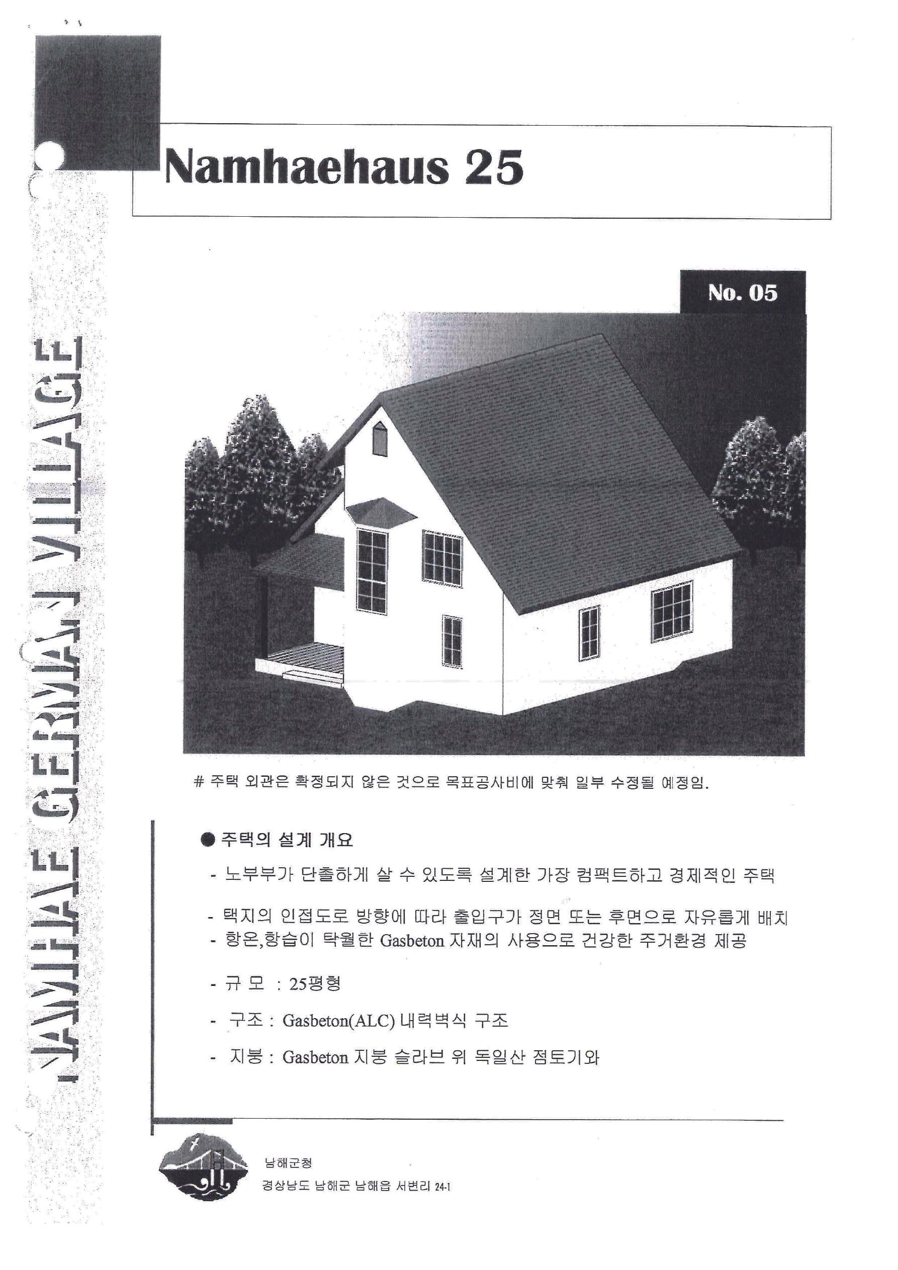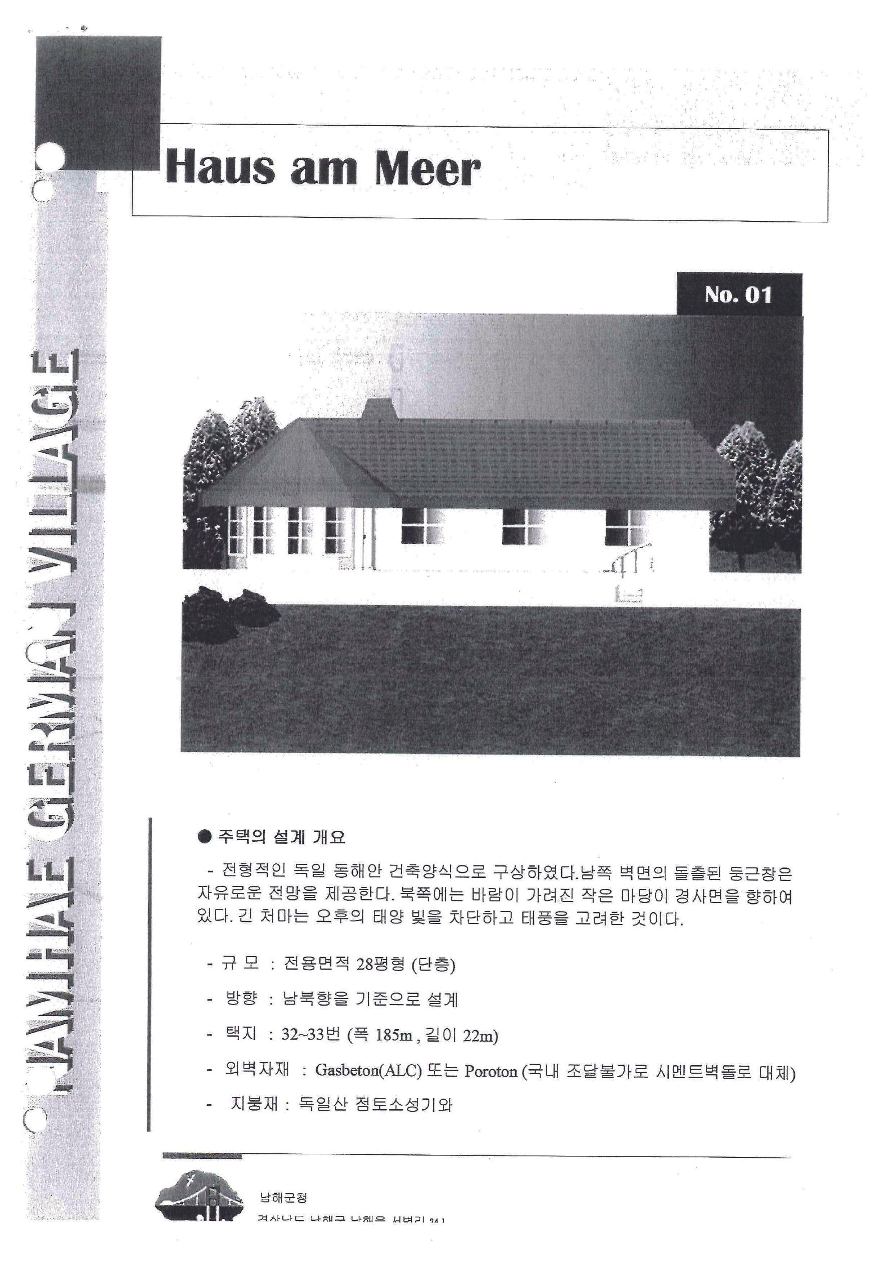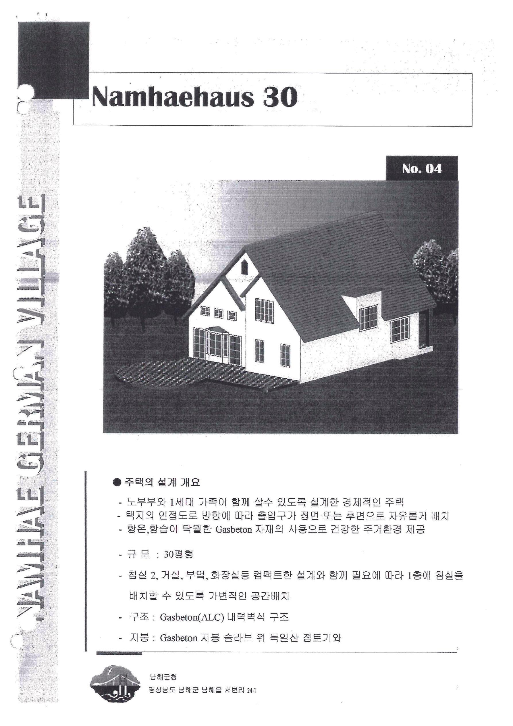 ○ 남해 독일마을 주택 모델 안내자료는 파독근로자들의 정착을 돕기 위해 설계된 다양한 주택 모델을 소개하는 중요한 자료입니다. 여러 측면에서 큰 역사적 가치를 지니고 있습니다. 이 자료는 1960년대와 1970년대에 독일로 파견된 한국인 광부와 간호사들이 귀국 후 안정적으로 정착할 수 있도록 돕기 위한 주택 모델들을 상세히 설명하고 있습니다.