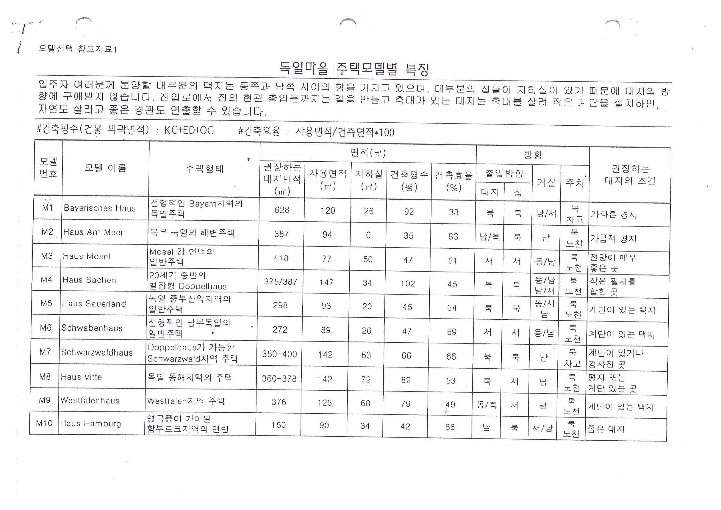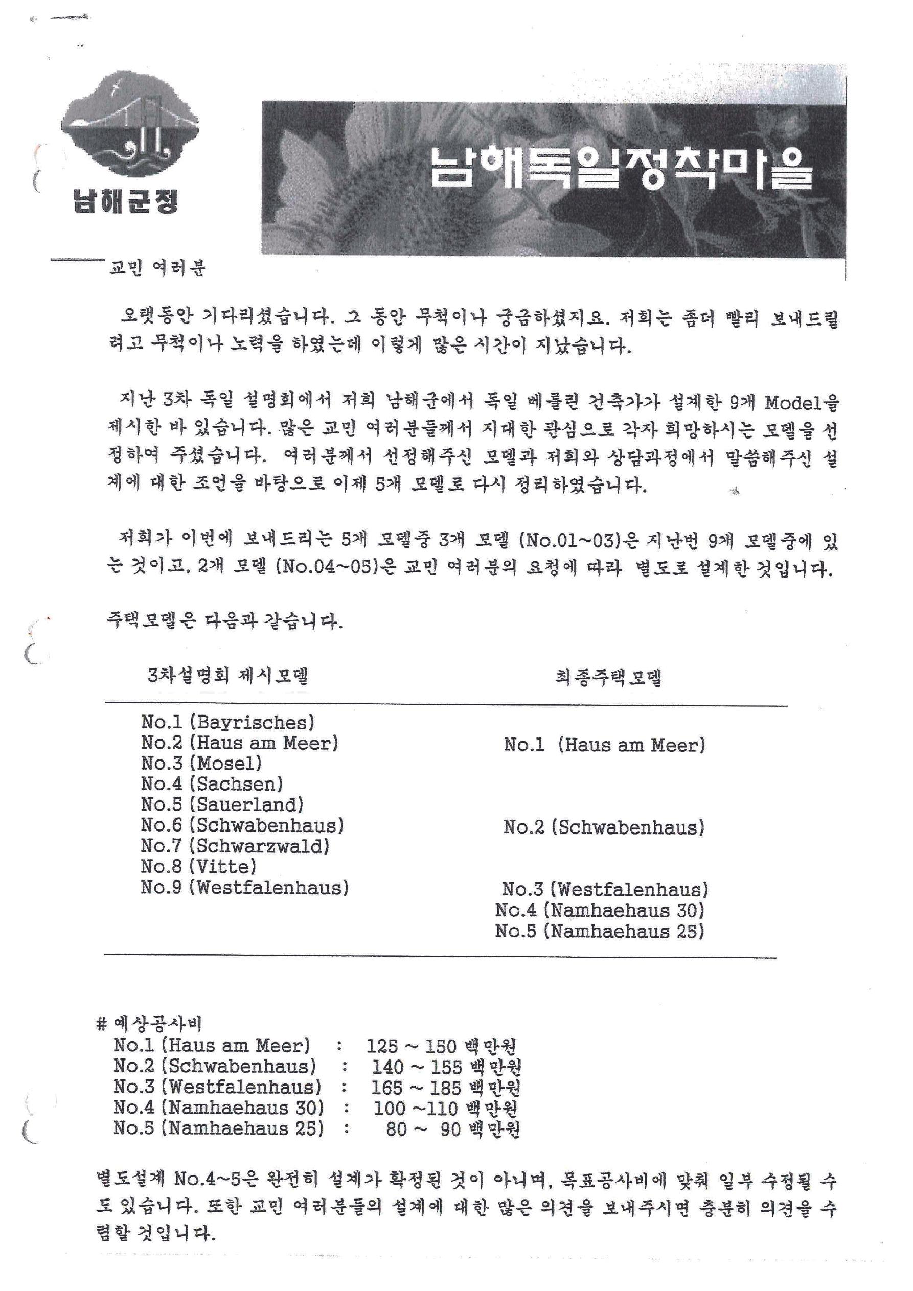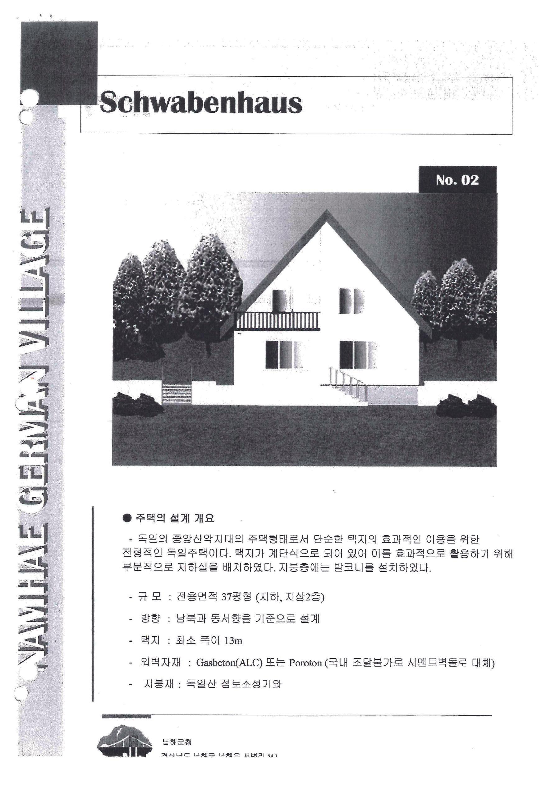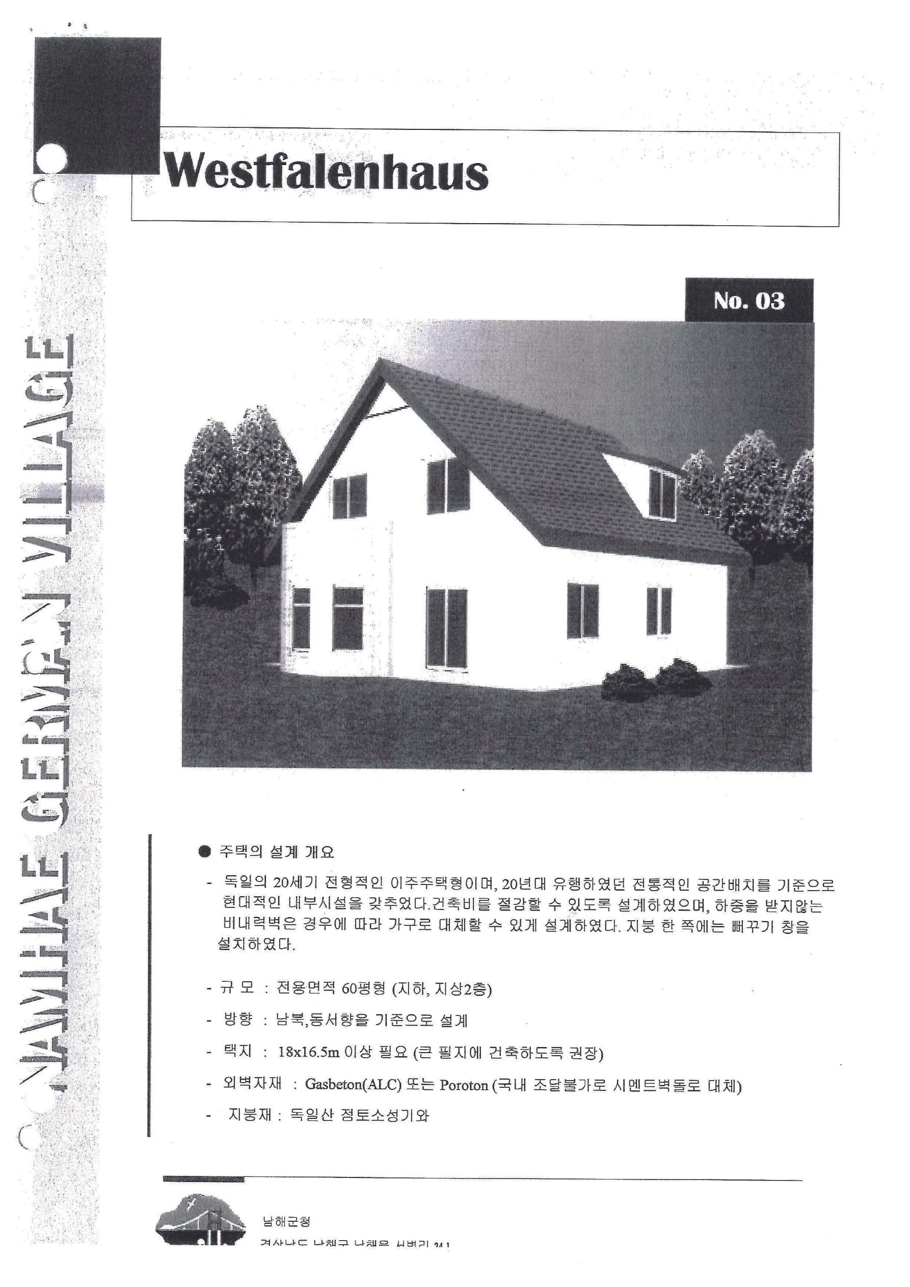 ○ 남해 독일마을 주택 모델 안내자료는 파독근로자들의 정착을 돕기 위해 설계된 다양한 주택 모델을 소개하는 중요한 자료입니다. 여러 측면에서 큰 역사적 가치를 지니고 있습니다. 이 자료는 1960년대와 1970년대에 독일로 파견된 한국인 광부와 간호사들이 귀국 후 안정적으로 정착할 수 있도록 돕기 위한 주택 모델들을 상세히 설명하고 있습니다.