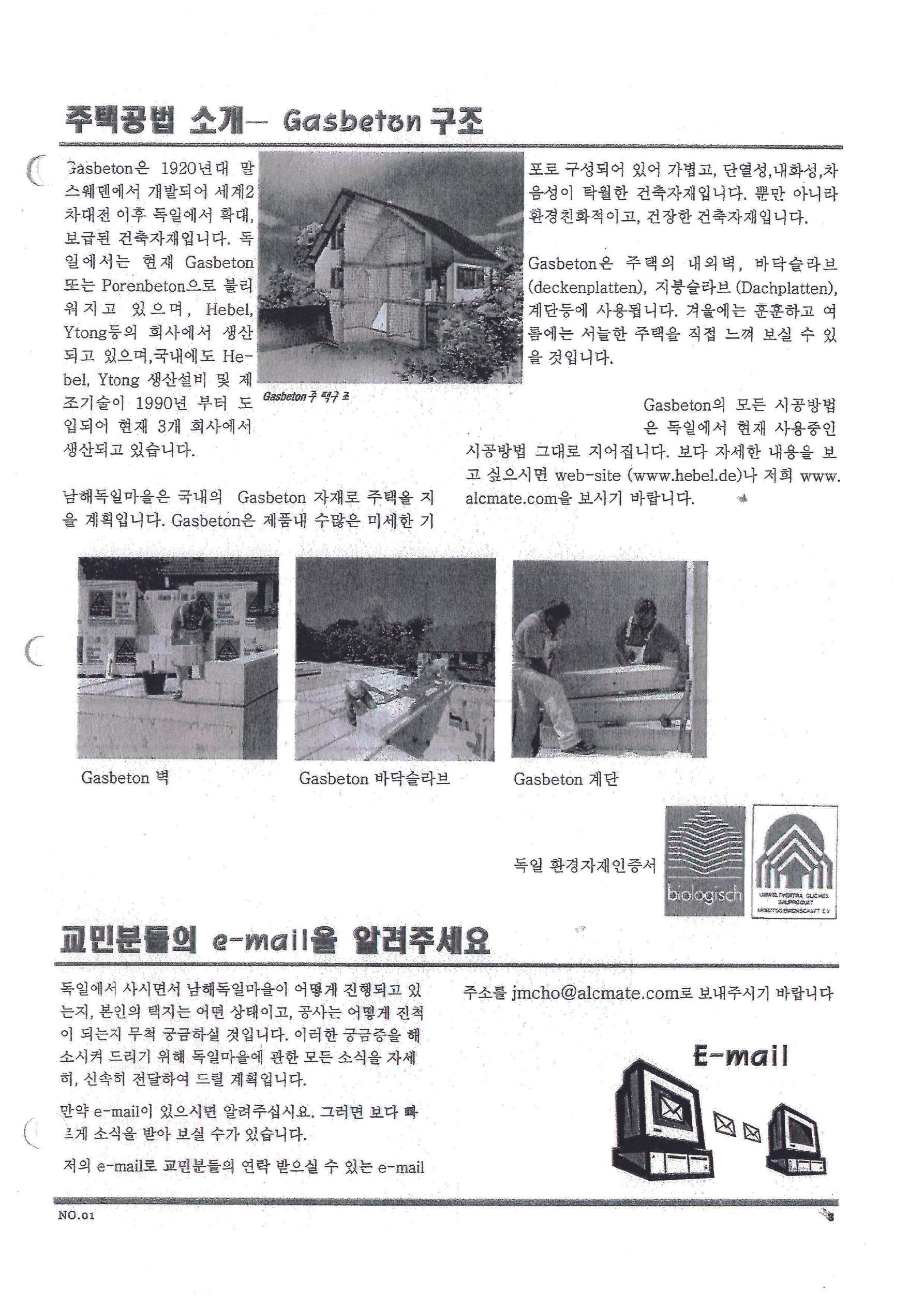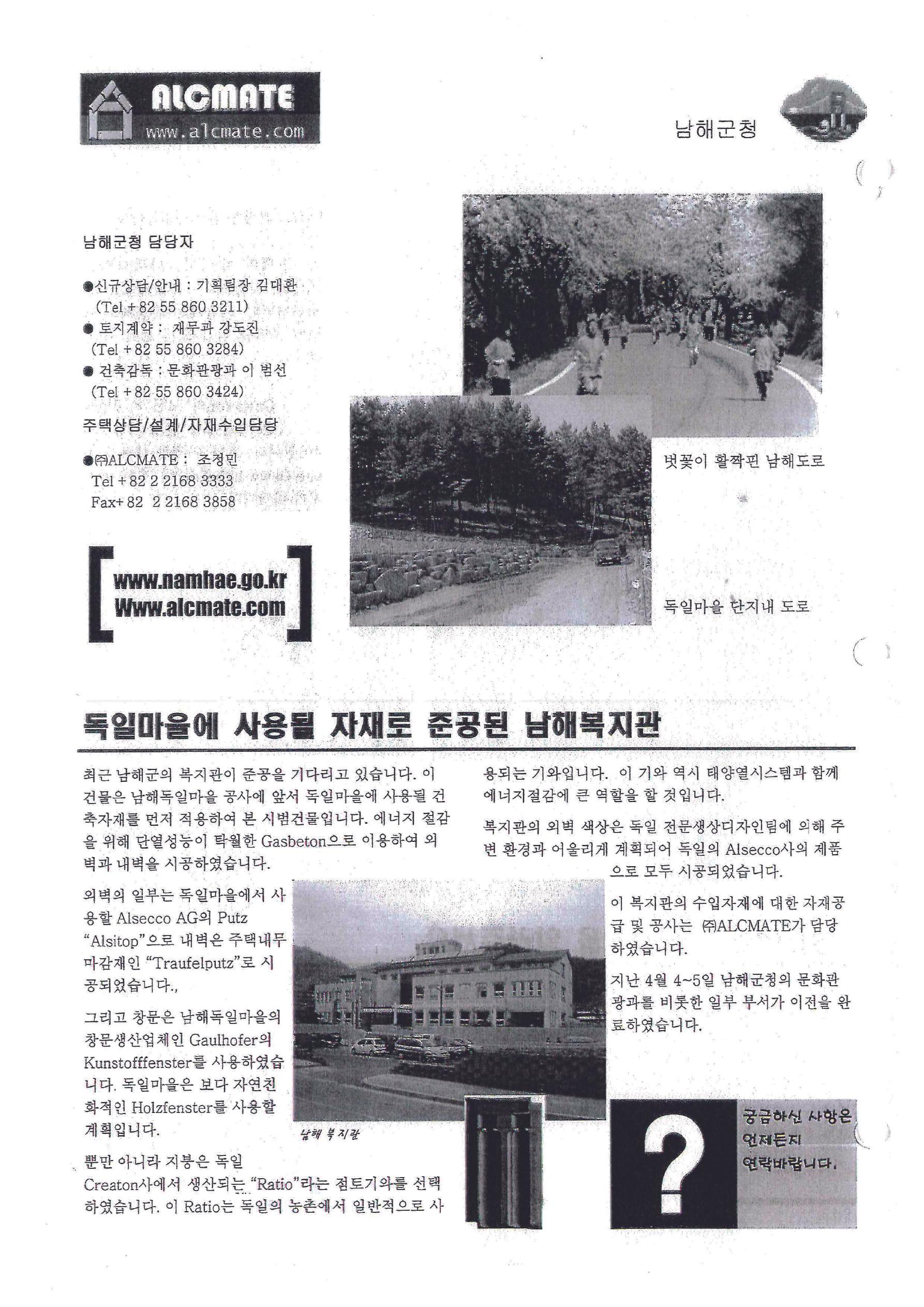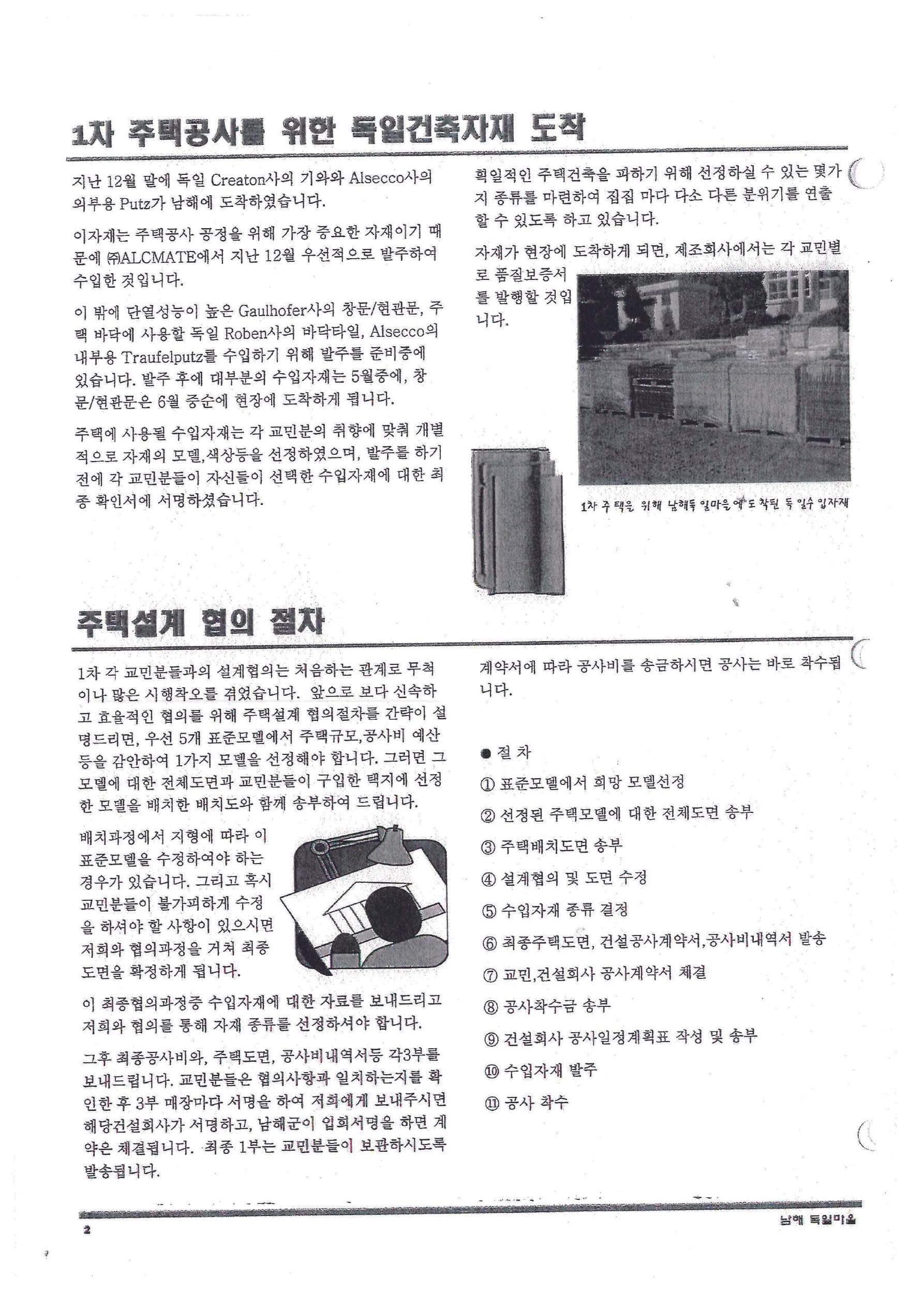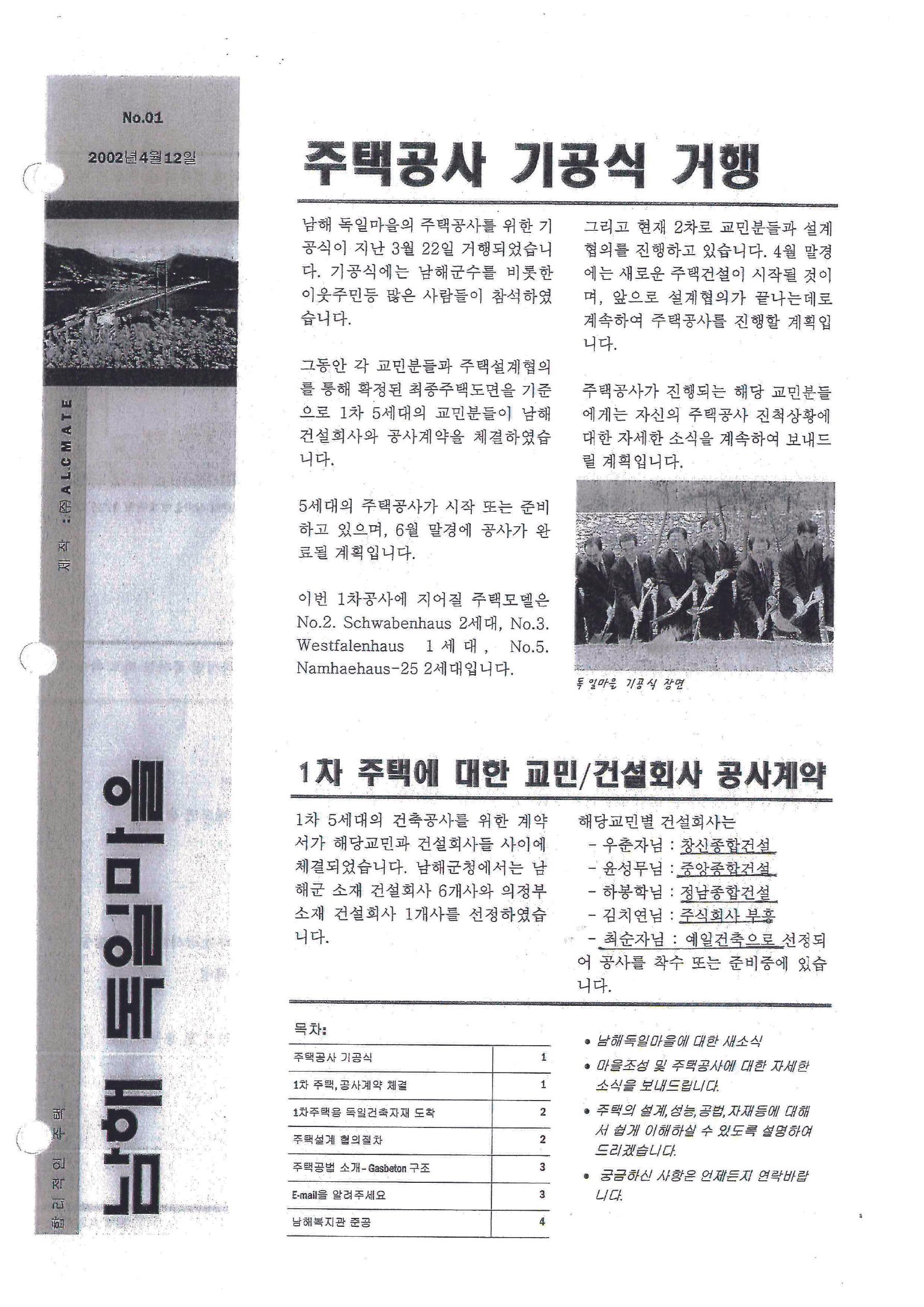 ○ 2002년 3월 22일, 남해 독일마을에서 주택공사 기공식이 개최되었습니다. 이 행사에는 남해군수 및 많은 이웃 주민들이 참석했습니다. ○ 1차, 5세대의 교민분들이 건설회사와 공사계약을 체결하여 주택 건설이 본격적으로 시작되었습니다.